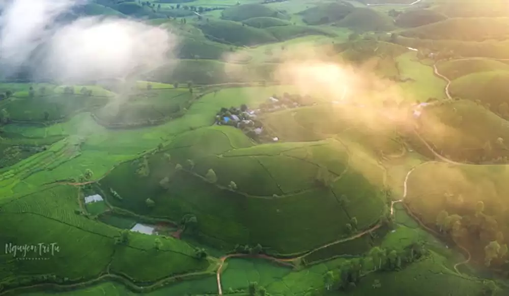 Chụp ảnh đồi chè vào lúc nắng còn chưa lên là đẹp nhất. Lúc này, sương bay là là và còn đọng trên lá, làn mây giăng giăng hờ hững trên đồi chè mang đến một tầm nhìn mờ ảo đẹp lạ kỳ.